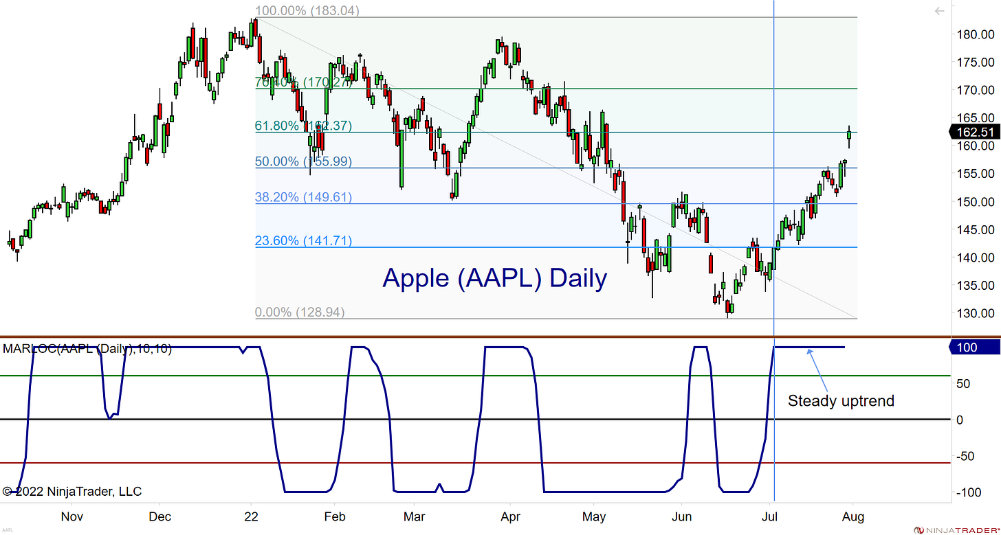 The Apple daily chart below illustrates its rapid recovery off the June lows to the 61.8% retracement level. The indicator in the lower panel was pegged at +100 since early July showing a steady uptrend.