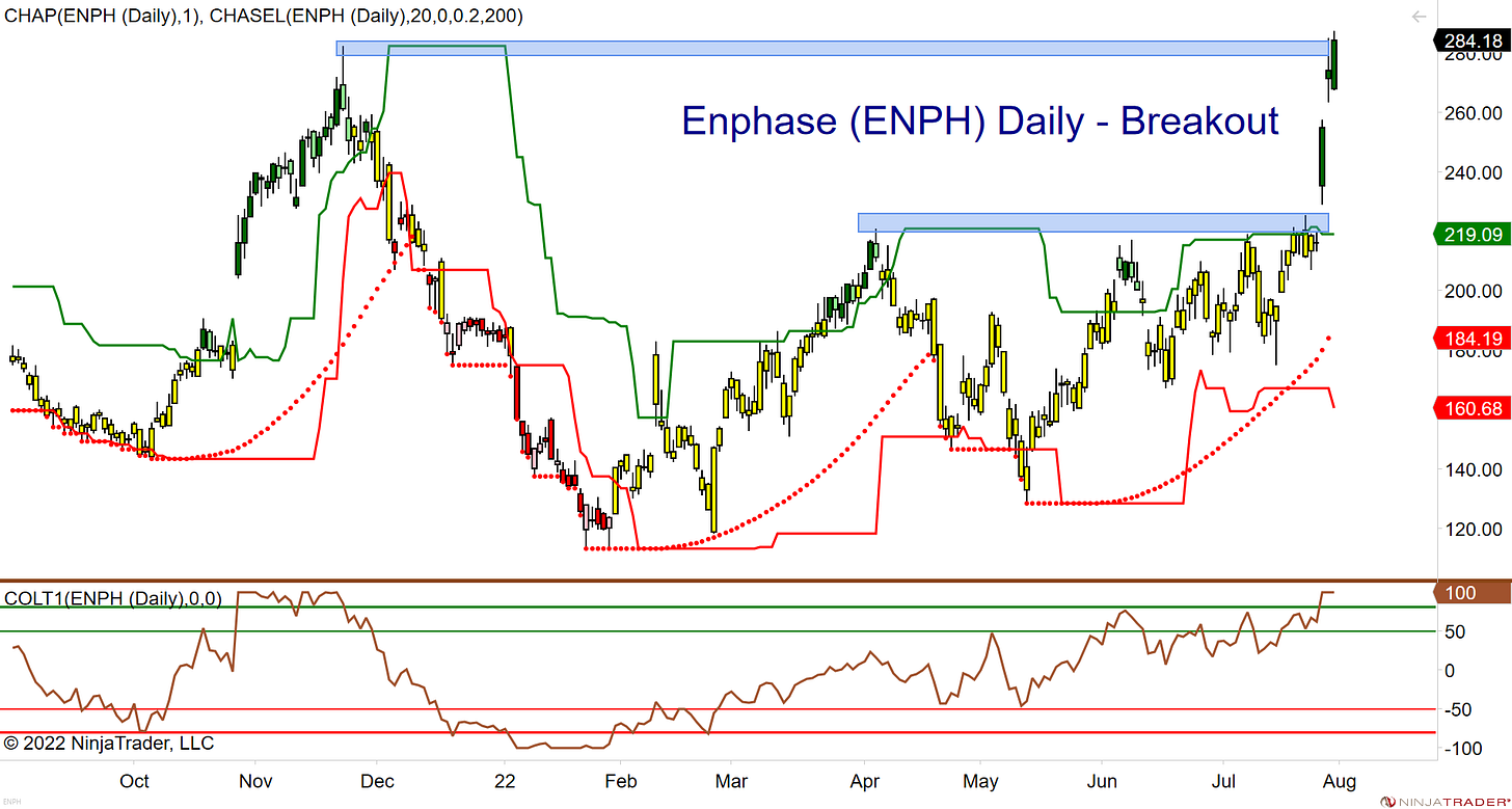 The Schumer-Manchin reconciliation bill has a hefty allocation of $62 billion toward manufacturing clean energy products. There is also greater interest coming out of Europe as they try to diversify away from Russian-supplied natural gas. US solar stocks rocketed higher Thursday and Friday after news broke about the agreement. This week some also reported strong earnings. We start with Enphase, which after a four-month consolidation, took only three days to reach its November 2021 highs.