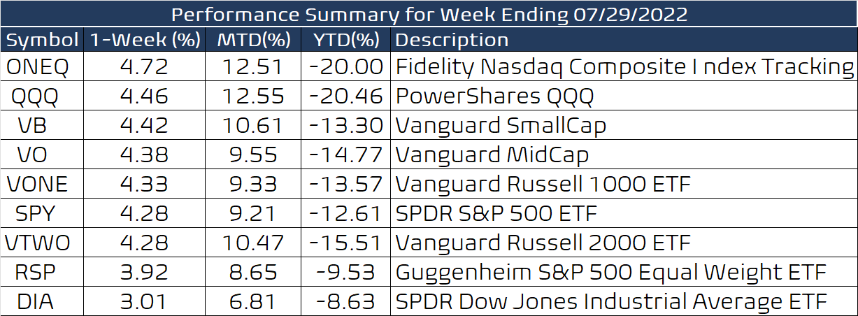 As we expected last week from our net bull/bear indicator, the uptrend continued, despite a data-heavy week (165 companies in the theS&P-500 index reported earnings) and the FOMC meeting mid-week. Tech titans Apple, Microsoft, Google, and Amazon all rallied, which helped the QQQ and the $SPX. The $VIX index continued to decline, supporting the view that the summer rally had commenced.